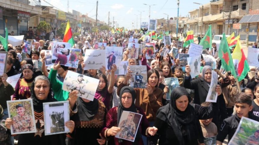 Xwepêşandan ji Qada Şehîd Xebat bi tevlêbûna girseyî û bi hildana wêneyên dîlgirtiyan û pankartên banga berdana wan dikin dest pê kir.
