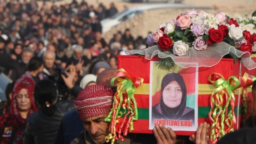 Bi hezaran şêniyên taxên Şêxmeqsûd û Eşrefiyê yên Helebê cenazeyê şehîd Fedwa Mihemed El Kurdî (57) ku di êrişa komên hikumeta veguhêz ên li ser taxên Şêxmeqsûd û Eşrefiyê yên di 22’yê Kanûnê de şehîd bûbû, li Pakrewangeha Şehîdan a li herêma Şeqîf spart axê.